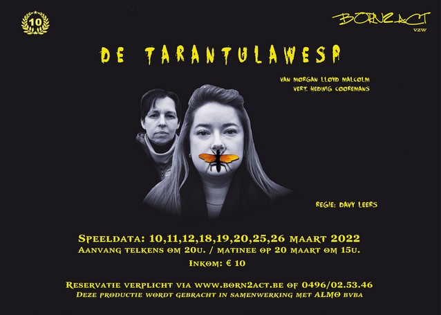 DE TARANTULAWESP TARANTULAWESP Regie: Davy Leers Inhoud Heather en Carla hebben elkaar sinds school niet meer gezien. Hun levens hebben heel verschillende wegen ingeslagen: Carla leidt een marginaal bestaan, terwijl Heather een hoogvliegende carrière en een prachtig huis heeft. Dan, tijdens de thee, geeft Heather Carla een zak geld en een voorstel. Deze ijzingwekkende nieuwe thriller stelt de vraag hoe ver buiten de speeltuin we onze jeugdervaringen meedragen. Deze productie wordt gebracht in samenwerking met Auteursbureau ALMO bvba.